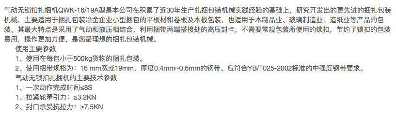 QWK-16/19A型手动无锁扣扎捆机主要用于捆扎包装彩色卷板和外包装使用木箱的产品,也适用于木制品业、造纸业、玻璃制造业的产品捆扎包装。其特点是以操作者的双手为动力,操作灵活方便、快捷。适应任何场地作业。本机不使用锁扣、降低了包装成本